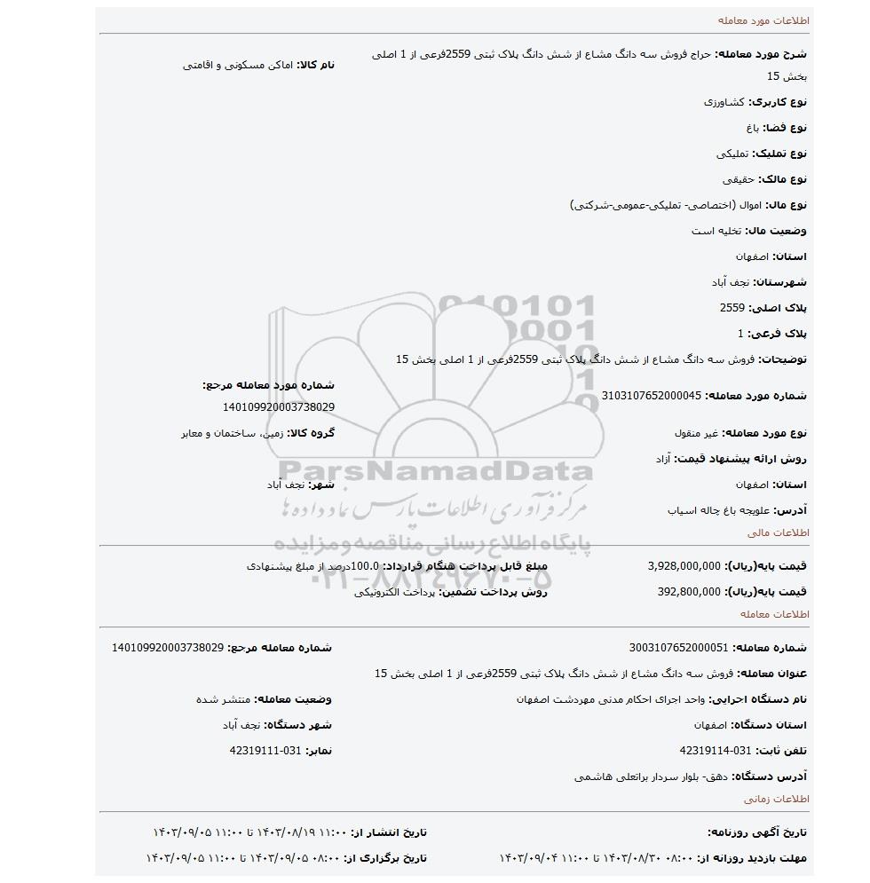 | شرح مورد معامله: حراج فروش سه دانگ مشاع از شش دانگ پلاک ثبتی 2559فرعی از 1 اصلی بخش 15 | نام کالا: اماکن مسکونی و اقامتی | |