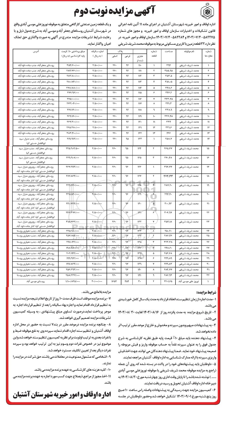 اداره اوقاف و امور خیریه شهرستان آشتیان در اجرای ماده 11 آئین نامه اجرایی قانون تشکیلات و اختیارات سازمان اوقاف و امور خیریه و مجوزهای شماره 582275 - 1403.7.4 و 582284 - 1403.7.4 سازمان اوقاف امور خیریه در نظر دارد 32 قطعه زمین با کاربری مسکونی مربوط به موقوفه محمد شریف شریفی و یک قطعه زمین صنعتی کارگاهی متعلق به موقوفه نوروزعلی موسی آبادی واقع در شهرستان آشتیان روستاهای جعفرآباد و موسی آباد به شرح جدول ذیل و با رعایت شرایط تشریفات مزایده مندرج در آگهی به صورت واگذاری حق تملک اعیان واگذار نماید.