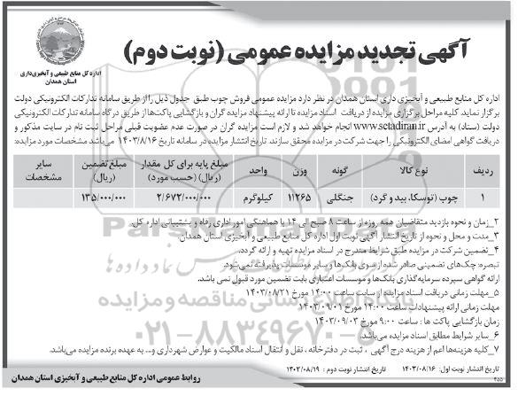 اداره کل منابع طبیعی و آبخیری داری استان همدان در نظر دارد مزایده عمومی فروش چوب طبق جدول ذیل را از طریق سامانه تدارکات الکترونیکی دولت برگزار نماید. کلیه مراحل برگزاری مزایده از دریافت اسناد مزایده تا ارائه پیشنهاد مزایده گران و بازگشایی پاکت ها از طریق درگاه سامانه تدارکات الکترونیکی دولت (ستاد) به آدرس ستاد ایران انجام خواهد شد و لازم است مزایده گران در صورت عدم عضویت قبلی مراحل ثبت نام در سایت مذکور و دریافت گواهی امضای الکترونیکی را جهت شرکت در مزایده محقق سازند. تاریخ انتشار مزایده در سامانه تاریخ 1403.8.16 می باشد مشخصات مورد مزایده: