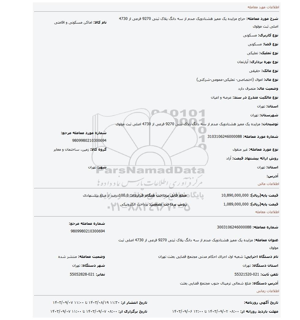 شرح مورد معامله: حراج مزایده یک ممیز هشتادویک صدم از سه دانگ پلاک ثبتی 9270 فرعی از 4730 اصلی ثبت مولوی نام کالا: اماکن مسکونی و اقامتی