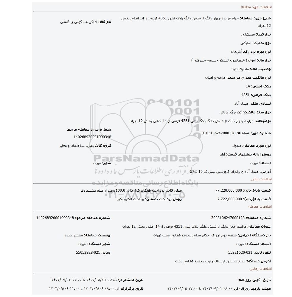 | عنوان معامله: مزایده چهار دانگ از شش دانگ پلاک ثبتی 4351 فرعی از 14 اصلی بخش 12 تهران | ||