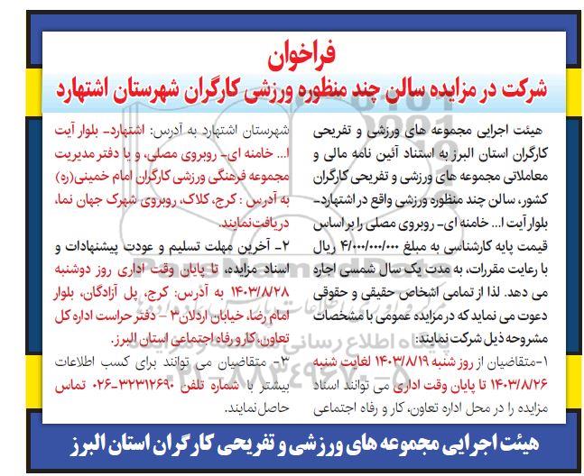 فراخوان شرکت در مزایده سالن چند منظوره ورزشی کارگران شهرستان اشتهارد