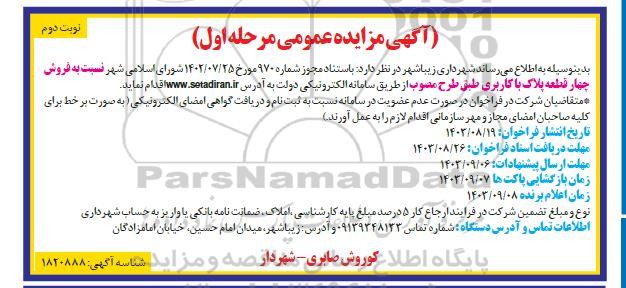 بدینوسیله به اطلاع می رساند شهرداری زیباشهر در نظر دارد با استناد مجوز شماره 970 مورخ 1403.7.25 شورای اسلامی شهر نسبت به فروش چهار قطعه پلاک با کاربری طبق طرح مصوب از طریق سامانه تدارکات الکترونیکی دولت به آدرس سایت ستاد اقدام نماید.