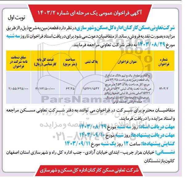 عنوان فراخوان: واگذاری مقدار یک و نیم دانگ مشاع از یک قطعه زمین به مساحت 63.25 متر مربع (کل مساحت پلاک 253 مترمربع می باشد) تحت پلاک ثبتی 1532 فرعی از 15261 اصلی بخش 5 ثبتی اصفهان واقع در میدان دفاع مقدس - جنب ترمینال صفه - اراضی چشمه توتی