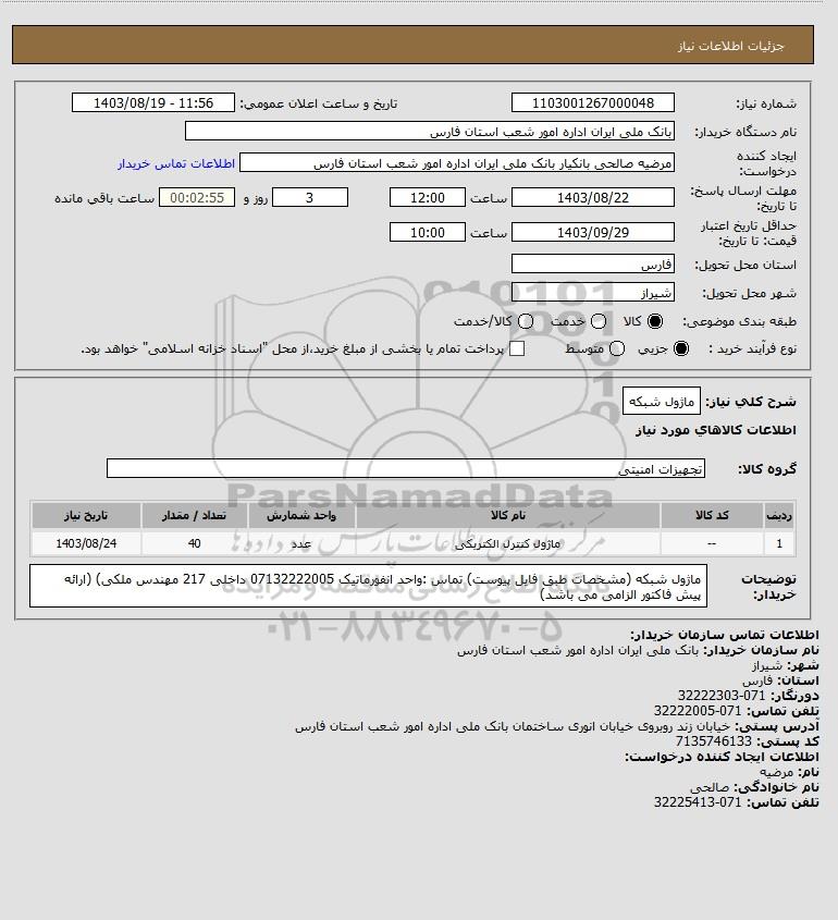 توضیحات خریدار:ماژول شبکه (مشخصات طبق فایل پیوست) تماس :واحد انفورماتیک 07132222005 داخلی 217 مهندس ملکی) (ارائه پیش فاکتور الزامی می باشد)