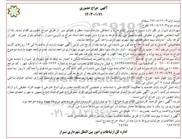 شهرداری شیراز در نظر دارد نسبت به فروش اقلام مازاد و اسقاطی سازمان سیما، منظر و فضای سبز از طریق حراج حضوری اقدام نماید. لذا از کلیه اشخاص حقیقی و حقوقی دعوت بعمل می آید با توجه به موارد ذیل جهت اخذ اسناد حراج به آدرس : شیراز - ابتدای بلوار چمران - قبل از کوچه یک سازمان سیما منظر فضای سبز شهری شهرداری واحد کپی مراجعه نمایند. متقاضیانی که مایل به شرکت در حراج مذکور میباشند میتوانند بعد از تاریخ نشر اولین آگهی جهت بازدید از ساعت 8 الی 13 روزهای کاری به آدرس شریف آباد - جنب پارک شهروند - انبار سازمان سیما منظر فضای سبز شهری شهرداری مراجعه نمایند. عدم مراجعه جهت بازدید موضوع حراج به منزله رویت بوده و چنانچه برنده حراج بعدا اظهار به جهل نماید پذیرفته نخواهد شد.