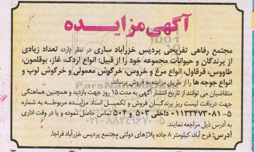 مجتمع رفاهی تفریحی پردیس خزرآباد ساری در نظر دارد تعداد زیادی از پرندگان و حیوانات مجموعه خود را از قبیل: انواع اردک، غاز، بوقلمون، طاووس، قرقاول، انواع مرغ و خروس، خرگوش معمولی و خرگوش لوپ و انواع جوجه ها را از طریق مزایده به فروش برساند.