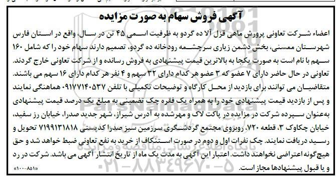 اعضاء شرکت تعاونی پرورش ماهی قزل آلا ده گردو به ظرفیت اسمی 45 تن در سال، واقع در استان فارس شهرستان ممسنی، بخش دشمن زیاری سرچشمه رودخانه ده گردو، تصمیم دارند سهام خود را که شامل 160 سهم با نام است به صورت یکجا به بالاترین قیمت پیشنهادی به فروش رسانده و از شرکت تعاونی خارج گردند. تعاونی در حال حاضر دارای 7 عضو که 3 عضو هر کدام دارای 32 سهم و 4 نفر هر کدام دارای 16 سهم می باشند. متقاضیان می توانند برای بازدید از محل کارگاه و توضیحات تکمیلی با تلفن 09177140537 هماهنگی نمایند و پس از بازدید قیمت پیشنهادی خود را به همراه یک فقره چک تضمینی به مبلغ یک درصد قیمت پیشنهادی به عنوان سپرده شرکت در مزایده در پاکت لاک و مهر شده به آدرس شیراز، شهر جدید صدرا، خیابان رز سفید، خیابان چکاوک 3، قطعه 720، روبروی مجتمع گردشگری سرزمین سبز صدرا کدپستی 7199131818 تحویل و رسید دریافت نمایند. چک نفرات اول و دوم در صورت استنکاف از خرید به نفع تعاونی ضبط خواهد شد و حق هیچگونه اعتراضی نخواهند داشت. اعتبار این آگهی به مدت یک ماه از تاریخ انتشار آگهی می باشد. شرکت در رد و یا قبول پیشنهادها مجاز است.