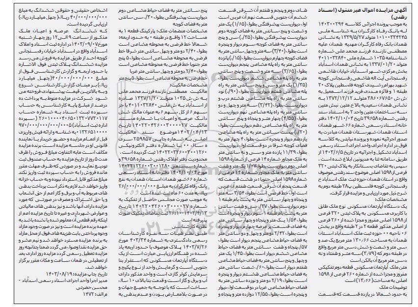 آگهی مزایده اموال غیر منقول (اسناد رهنی)