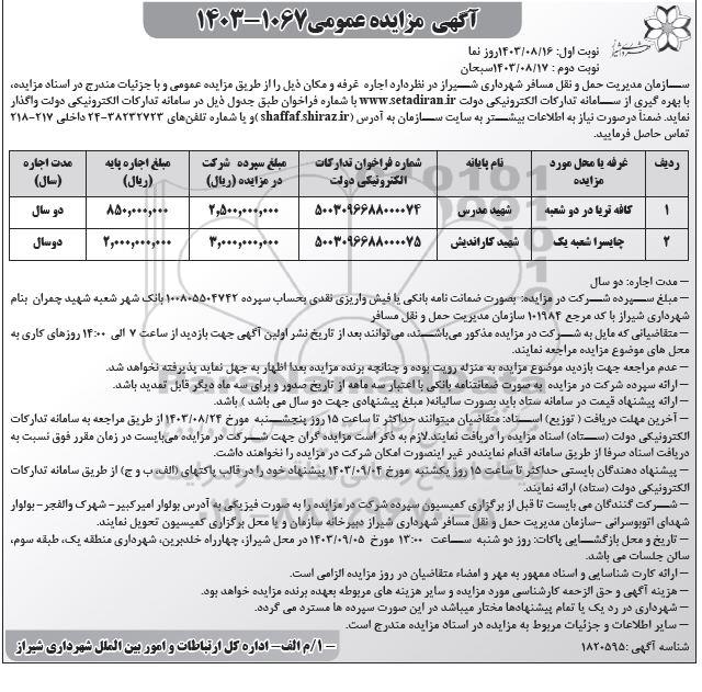 سازمان مدیریت حمل و نقل مسافر شهرداری شیراز در نظر اجاره غرفه و مکان ذیل را از طریق مزایده عمومی و با جزئیات مندرج در اسناد مزایده با بهره گیری از سامانه تدارکات الکترونیکی دولت سایت ستاد ایران با شماره فراخوان طبق جدول ذیل در سامانه تداركات الکترونیکی دولت الکترونیکی واگذار نماید ضمنا در صورت نیاز به اطلاعات بیشتر به سایت سازمان به ادرس shaffaf.shiraz.ir و یا شماره تلفن های 24 - 38232723- داخلی 217 - 218 تماس حاصل فرمایید.