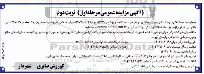 بدینوسیله به اطلاع میرساند شهرداری زیبا شهر در نظر دارد باستناد مجوز شماره 1127 مورخ 1403.6.27 شورای اسلامی شهر نسبت به فروش یک قطعه پلاک 240 متری با کاربری تجاری از طریق سامانه الکترونیکی دولت به آدرس ستاد ایران اقدام نماید.