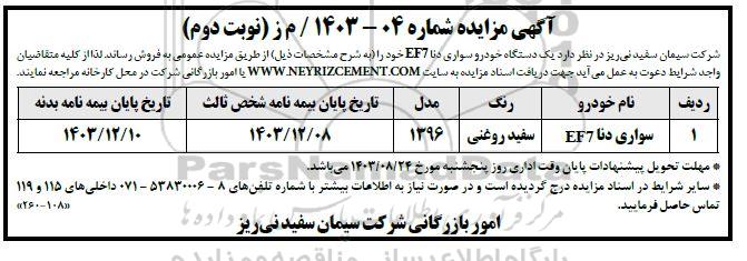شرکت سیمان سفید نی ریز در نظر دارد یک دستگاه خودرو سواری دنا EF۷ خود را (به شرح مشخصات ذیل) از طریق مزایده عمومی به فروش رساند. لذا از کلیه متقاضیان واجد شرایط دعوت به عمل می آید جهت دریافت اسناد مزایده به سایت WWW.NEYRIZCEMENT.COM یا امور بازرگانی شرکت در محل کارخانه مراجعه نمایند.
