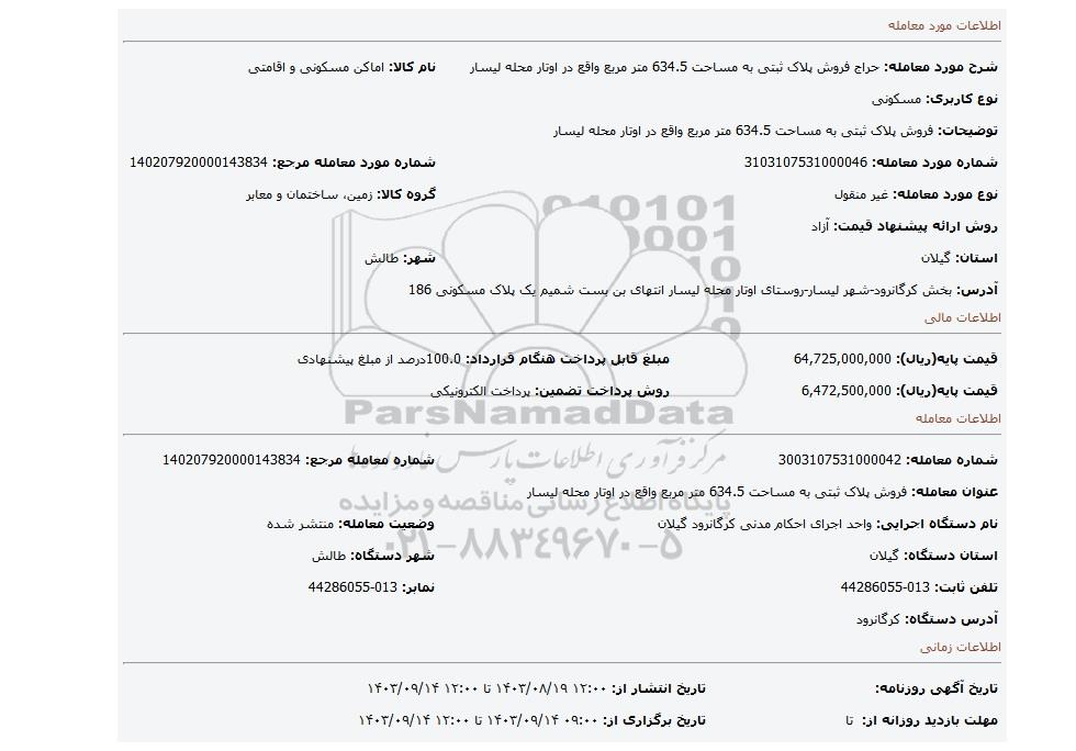 | شرح مورد معامله: حراج فروش پلاک ثبتی به مساحت 634.5 متر مربع واقع در اوتار محله لیسار | نام کالا: اماکن مسکونی و اقامتی | |