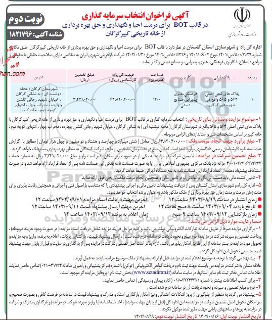 اداره کل راه و شهرسازی استان گلستان در نظر دارد با قالب BOT برای مرمت احیا و نگهداری و حق بهره برداری از خانه تاریخی کبیرگرگان طبق مکاتبه شماره 5003839 ص 1401 مورخ 1401/06/02 و 507/316 ص 1402 مورخ 1402/01/30 شرکت بازآفرینی شهری ایران به متقاضی دارای صلاحیت حقیقی یا حقوقی از مراجع ذیصلاح با کاربری فرهنگی . هنری پذیرایی و صنایع دستی واگذار نماید.