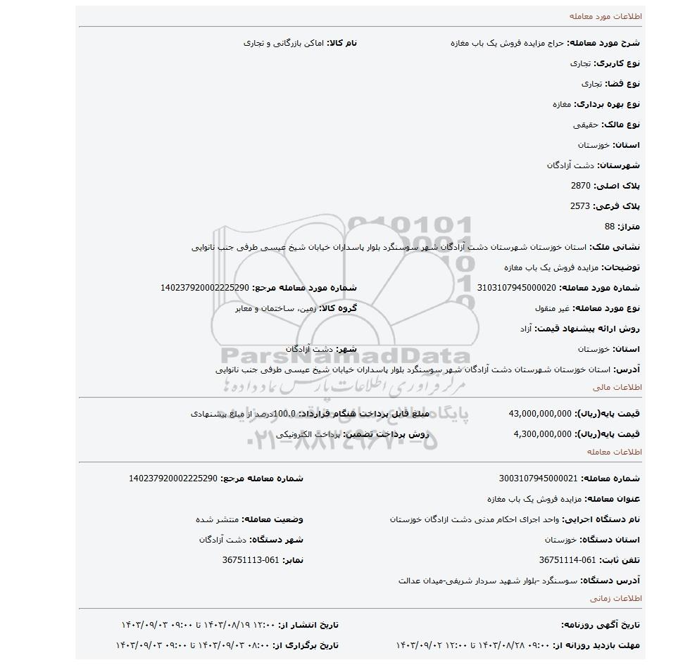 | شرح مورد معامله: حراج مزایده فروش یک باب مغازه | نام کالا: اماکن بازرگانی و تجاری | |