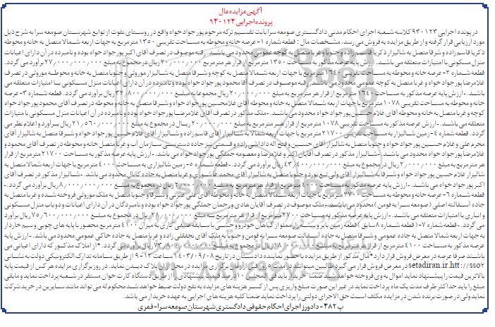 مزایده فروش : 1- عرصه خانه و محوطه به مساحت تقریبی 1350 متر مربع ، به مساحت 1350 متر مربع 2- عرصه خانه و محوطه به مساحت تقریبی 1640 مترمربع 3- عرصه خانه و محوطه به مساحت تقریبی 1078 متر مربع 4- زمین شالیزار به مساحت تقریبی 21700 متر مربع 5- زمین شالیزاری به مساحت 4000 متر مربع 6- عرصه خانه و محوطه به مساحت 2700 مت رمربع