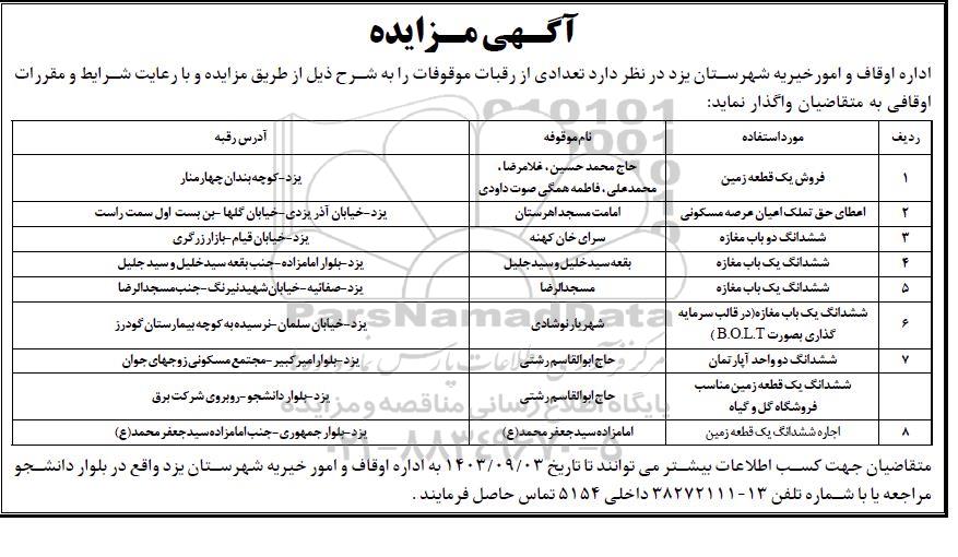 مزایده عمومی مزایده فروش یک قطعه زمین برگزار میگردد. از کلیه افراد متخصص و شرکت‌های واجد شرایط دعوت به عمل می‌آید تا در این مزایده با کد خبرگزاری پارس نماد : 8247638 شرکت نمایند تاریخ شروع مزایده : 1403/08/19 مهلت شرکت در مزایده: تا پایان روز 1403/09/03 مکان برگزاری اموال واگذاری استان‌های یزد و دسته‌بندی‌های مربوط به این حراجی املاک و زمین میباشد.