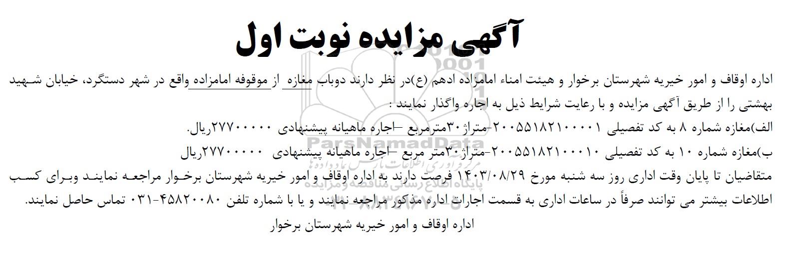 اداره اوقاف و امور خیریه شهرستان برخوار و هیئت امناء امامزاده ادهم (ع) در نظر دارند دو باب مغازه از موقوفه امامزاده واقع در شهر دستگرد، خیابان شهید