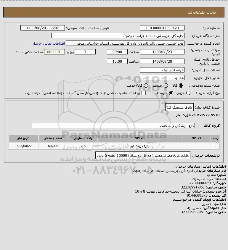 | 1 | -- | باتری زینک ایر | عدد | 60,000 | 1403/08/27 |
