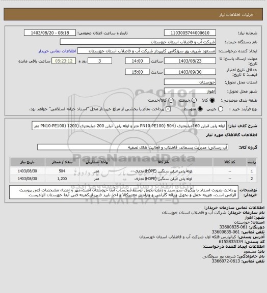 شرح کلی نیاز: لوله پلی اتیلن 160میلیمتری (PN10-PE100) 504 متر و لوله پلی اتیلن 200 میلیمتری (PN10-PE100) 1200 متر