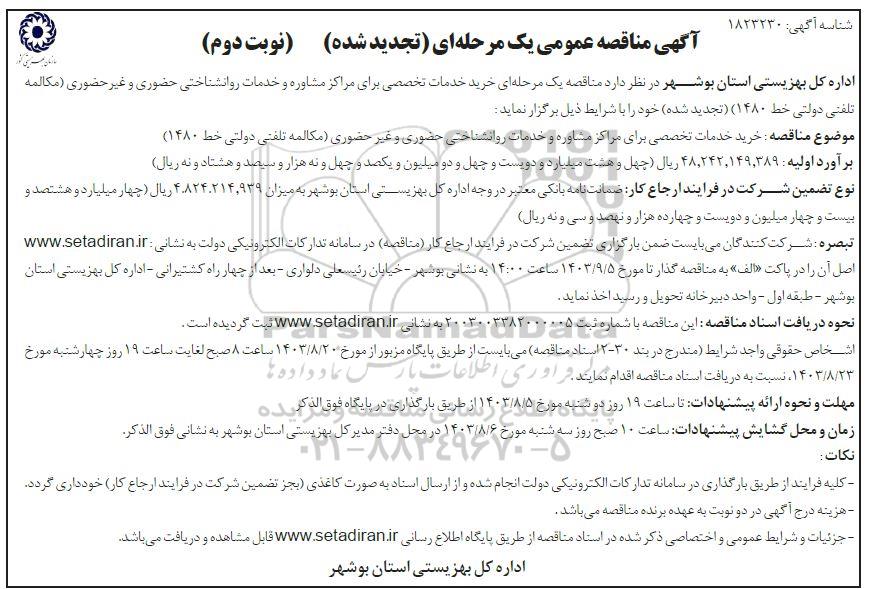 اداره کل بهزیستی استان بوشهر در نظر دارد مناقصه یک مرحله ای خرید خدمات تخصصی برای مراکز مشاوره و خدمات روانشناختی حضوری و غیر حضوری مکالمه تلفنی دولتی خط (1480) (تجدید شده) خود را با شرایط ذیل برگزار نماید :