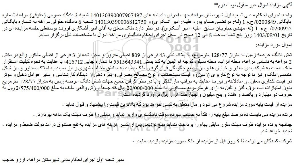 واحد اجرای احکام مدنی شعبه اول شهرستان مراغه جهت اجرای دادنامه های 140130390007907497 شعبه 3 دادگاه عمومی (حقوقی) مراغه شماره بایگانی 0200849/ج.م 1 (له: مرتضی صابرپور، علیه: امیر آشکاری) و 140130390006812750 شعبه 6 دادگاه حقوقی مراغه به شماره بایگانی 0200955/ ج.م. 1 (له: مهدی جباریان سابق. علیه: امیر آشکاری)، در نظر دارد ملک متعلق به آقای امیر آشکاری فرزند یوسفعلی جلسه مزایده ای در تاریخ 1403/09/01 روز پنج شنبه ساعت 8 الی 12 صبح در محل اجرای احکام دادگستری مراغه اموال با مشخصات ذیل برگزار نماید.