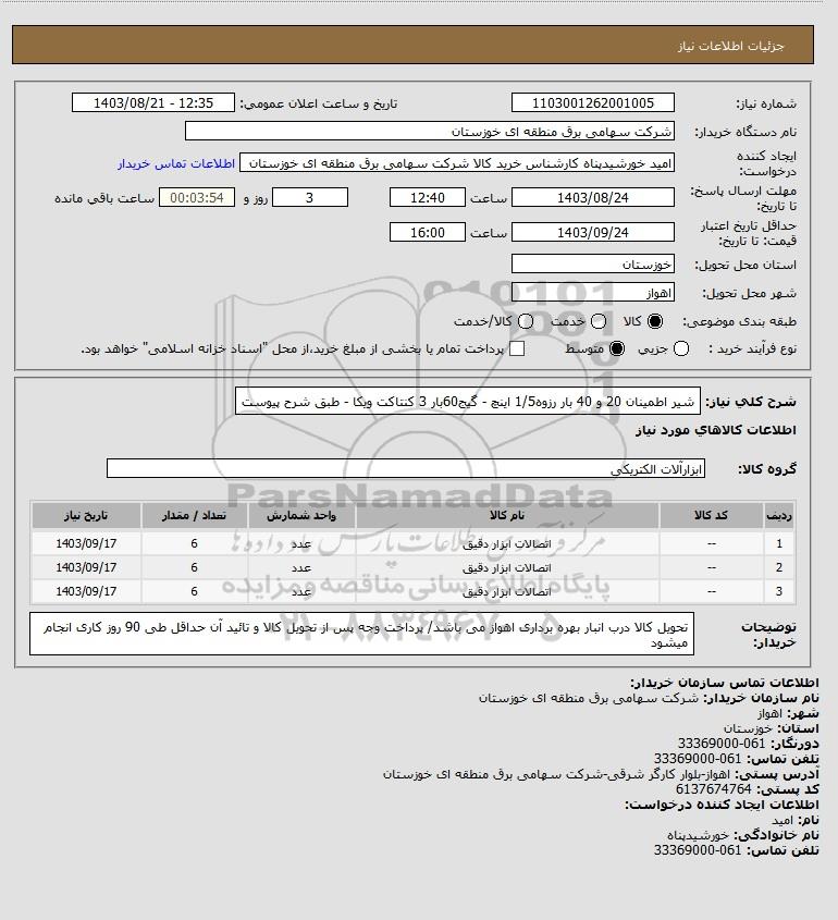 شرح کلی نیاز: شیر اطمینان 20 و 40 بار رزوه1/5 اینچ - گیج60بار 3 کنتاکت ویکا - طبق شرح پیوست