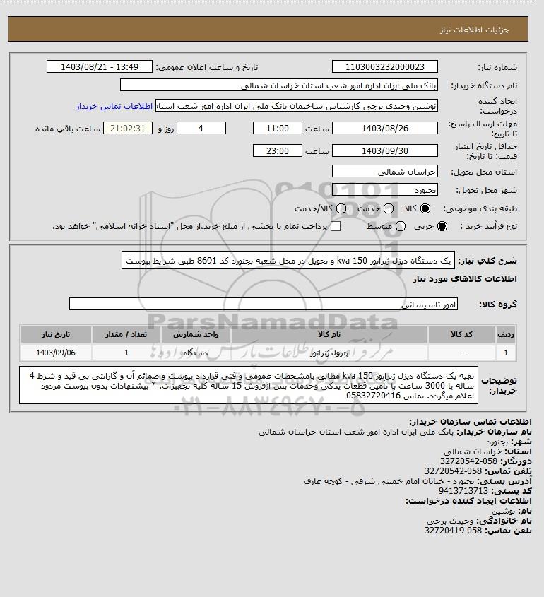 شرح کلی نیاز: یک دستگاه دیزل ژنراتور kva 150 و تحویل در محل شعبه بجنورد کد 8691 طبق شرایط پیوست