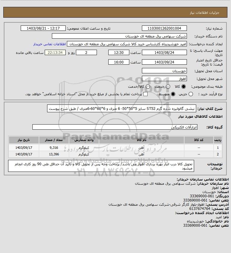 شرح کلی نیاز: نبشی گالوانیزه شده گرم ST52 سایز 5*50*50- 6 متری و 6*60*60-6متری / طبق شرح پیوست