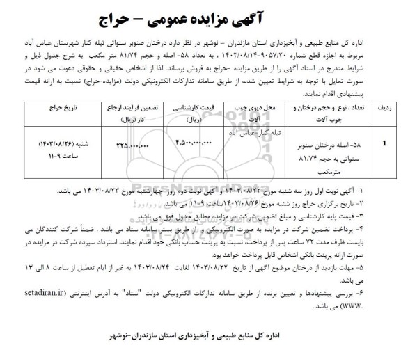 اداره کل منابع طبیعی و آبخیزداری استان مازندران - نوشهر در نظر دارد درختان صنوبر سنواتی تیله کنار شهرستان عباس آباد مربوط به اجازه قطع شماره 9057/20-1403/08/14 ، به تعداد 58 اصله و حجم 81/74 متر مکعب به شرح جدول ذیل و شرایط مندرج در اسناد آگهی را از طریق مزایده حراج به فروش برساند. لذا از اشخاص حقیقی و حقوقی دعوت می شود در صورت تمایل با توجه به شرایط تعیین شده از طریق سامانه تدارکات الکترونیکی دولت (مزایده -حراج) نسبت به ارائه قیمت پیشنهادی اقدام نمایند.