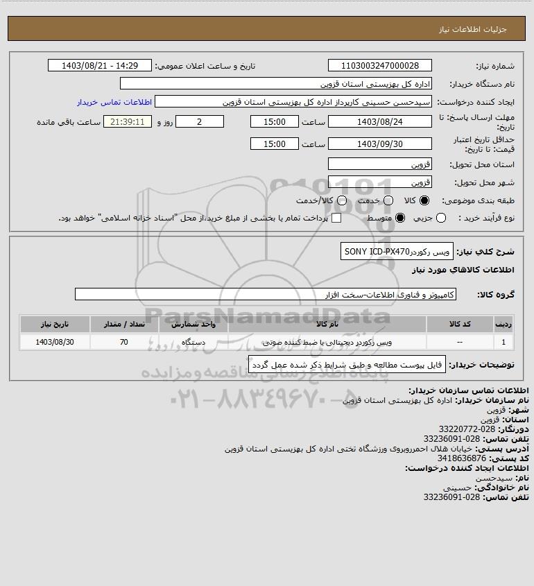 | 1 | -- | ویس رکوردر دیجیتالی یا ضبط کننده صوتی | دستگاه | 70 | 1403/08/30 |