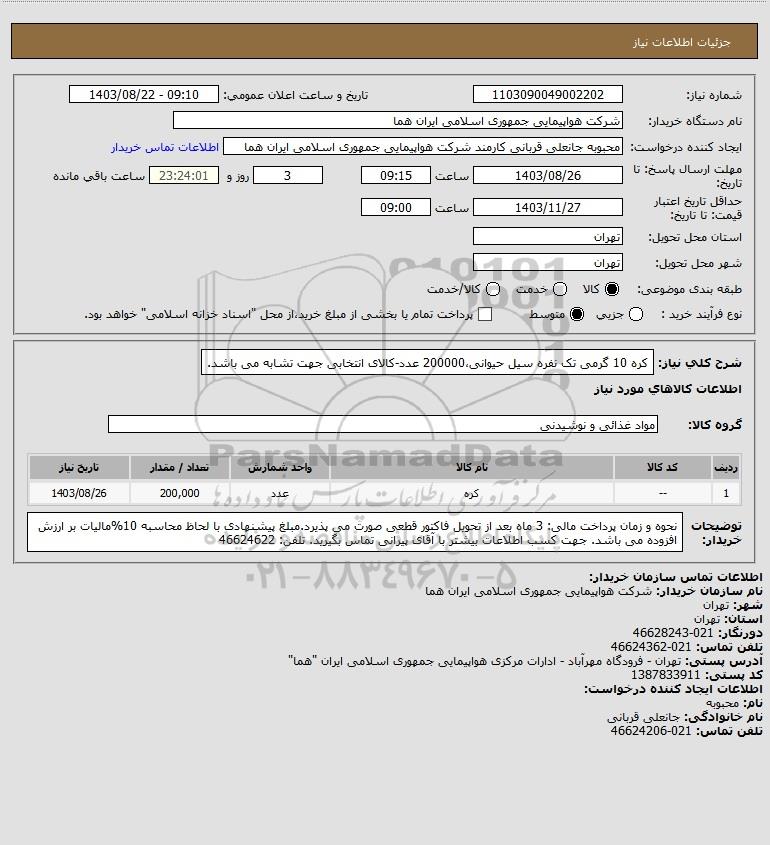 نام دستگاه خریدار:شرکت هواپیمایی جمهوری اسلامی ایران هما