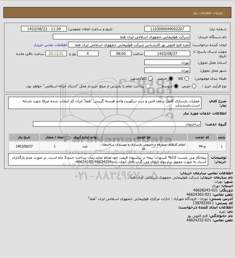 شرح کلی نیاز: عملیات بازسازی کامل سقف لابی و درب سکوریت واحد هسته گزینش "هما"،ایران کد انتخاب شده صرفا جهت تشابه است.بازدیدندارد