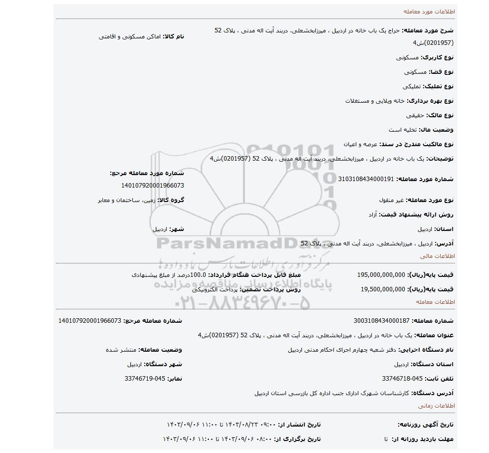 عنوان معامله: یک باب خانه در اردبیل ، میرزابخشعلی، دربند آیت اله مدنی ، پلاک 52 (0201957)ش4 | ||