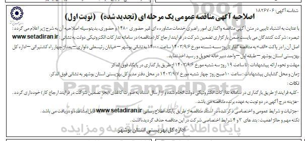 با عنایت به اشتباه تایپی در متن آگهی مناقصه واگذاری امور راهبری خدمات مشاوره های غیر حضوری 1480 و حضوری بدینوسیله اصلاحیه آن به شرح زیر اعلام می گردد.