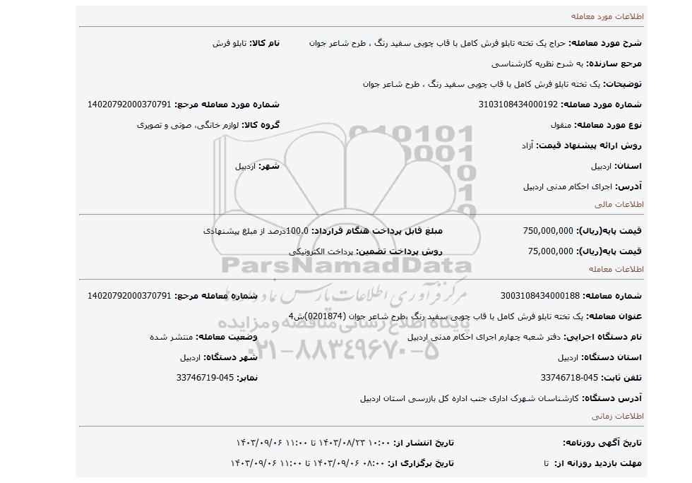 نام دستگاه اجرایی: دفتر شعبه چهارم اجرای احکام مدنی اردبیل | وضعیت معامله: منتشر شده | |