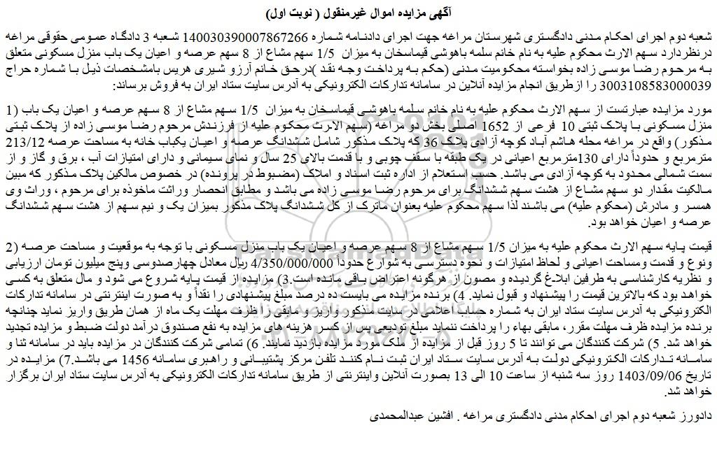 شعبه دوم اجرای احکام مدنی دادگستری شهرستان مراغه جهت اجرای دادنامه شماره 140030390007867266 شعبه 3 دادگاه عمومی حقوقی مراغه درنظردارد سهم الارث محکوم علیه به نام خانم سلمه باهوشی قیماسخان به میزان 1/5 سهم مشاع از 8 سهم عرصه و اعیان یک باب منزل مسکونی متعلق به مرحوم رضا موسی زاده بخواسته محکومیت مدنی (حکم به پرداخت وجه نقد )درحق خانم آرزو شیری هریس بامشخصات ذیل با شماره حراج 3003108583000039 را ازطریق انجام مزایده آنلاین در سامانه تدارکات الکترونیکی به آدرس سایت ستاد ایران به فروش برساند: