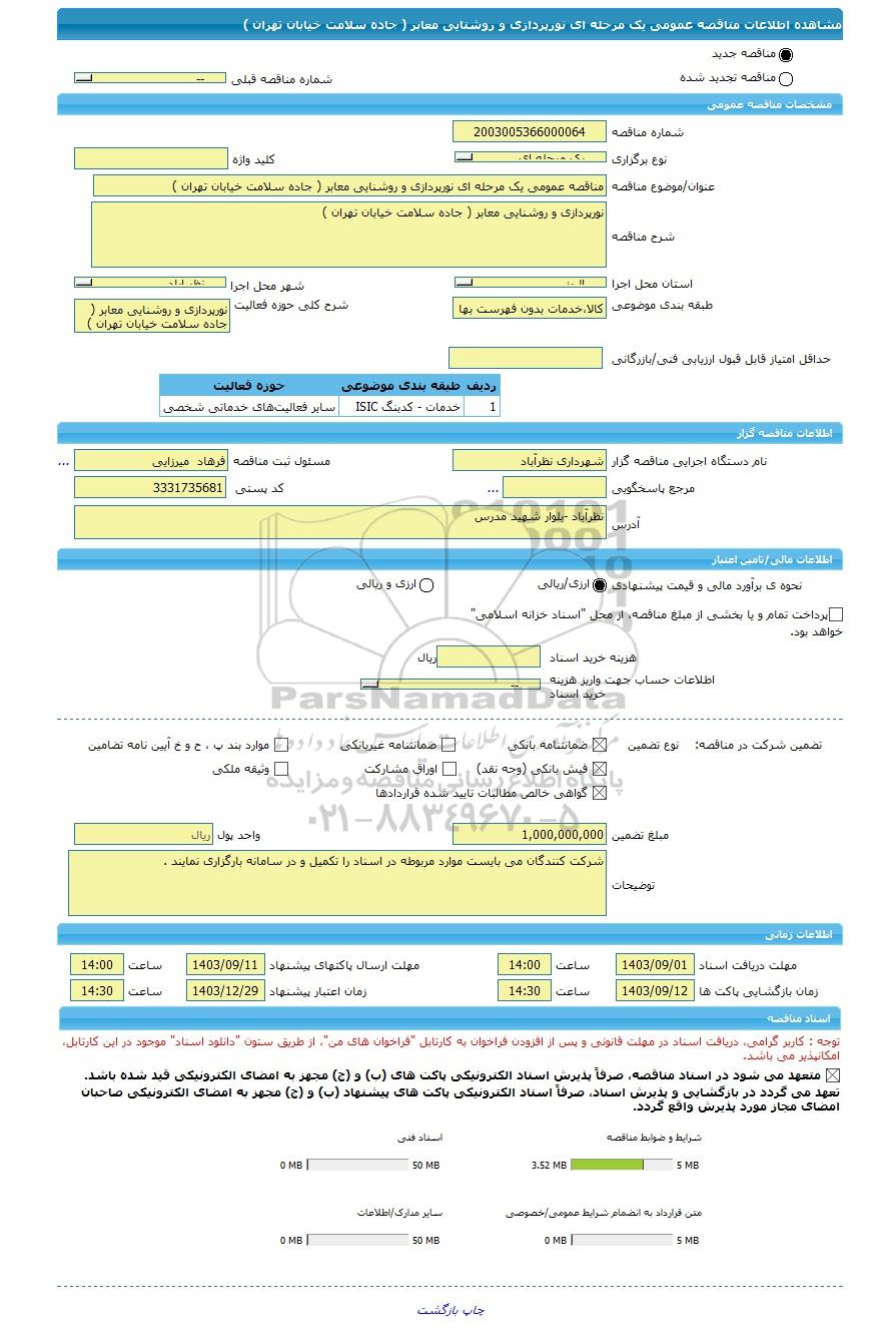 مناقصه مناقصه عمومی یک مرحله ای نورپردازی و روشنایی معابر ( جاده سلامت خیابان تهران ), مناقصه، مناقصه عمومی یک مرحله ای نورپردازی و روشنایی معابر ( جاده سلامت خیابان تهران )