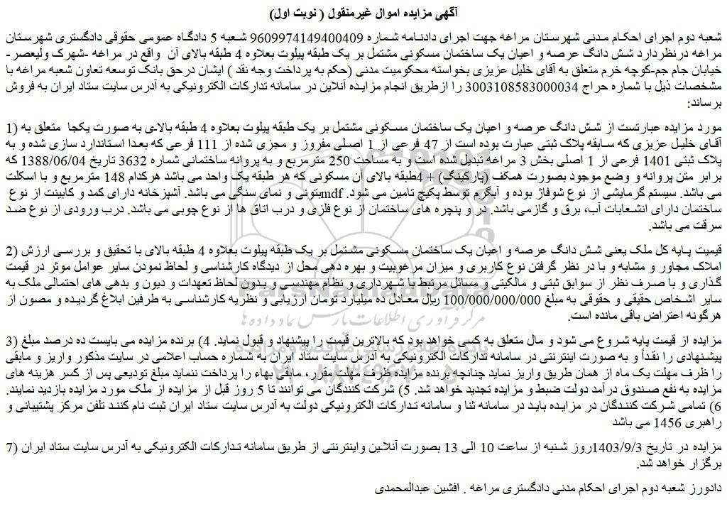 شعبه دوم اجرای احکام مدنی شهرستان مراغه جهت اجرای دادنامه شماره 9609974149400409 شعبه 5 دادگاه عمومی حقوقی دادگستری شهرستان مراغه درنظردارد شش دانگ عرصه و اعیان یک ساختمان مسکونی مشتمل بر یک طبقه پیلوت بعلاوه 4 طبقه بالای آن واقع در مراغه -شهرک ولیعصر- خیابان جام جم-کوچه خرم متعلق به آقای خلیل عزیزی بخواسته محکومیت مدنی (حکم به پرداخت وجه نقد ) ایشان درحق بانک توسعه تعاون شعبه مراغه با مشخصات ذیل با شماره حراج 3003108583000034 را ازطریق انجام مزایده آنلاین در سامانه تدارکات الکترونیکی به آدرس سایت ستاد ایران به فروش برساند:
