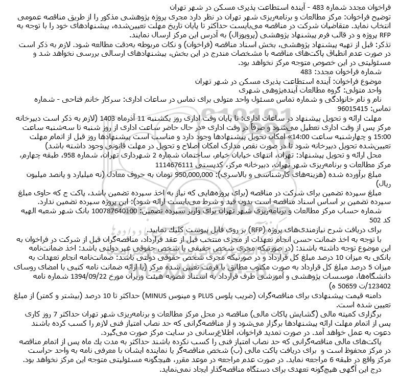 فراخوان مجدد شماره 483- آینده استطاعت پذیری مسکن در شهر تهران