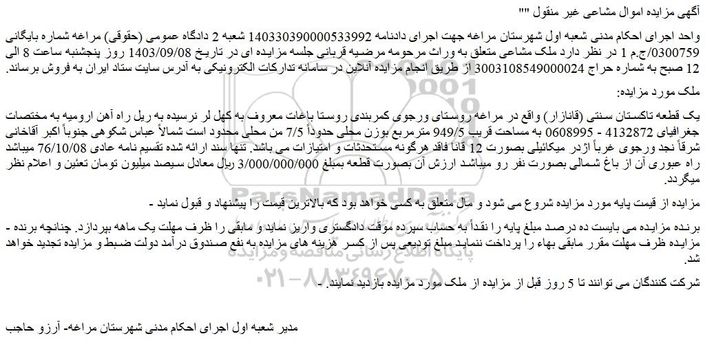 واحد اجرای احکام مدنی شعبه اول شهرستان مراغه جهت اجرای دادنامه 140330390000533992 شعبه 2 دادگاه عمومی (حقوقی) مراغه شماره بایگانی 0300759/ج.م 1 در نظر دارد ملک مشاعی متعلق به وراث مرحومه مرضیه قربانی جلسه مزایده ای در تاریخ 1403/09/08 روز پنجشنبه ساعت 8 الی 12 صبح به شماره حراج 3003108549000024 از طریق انجام مزایده آنلاین در سامانه تدارکات الکترونیکی به آدرس سایت ستاد ایران به فروش برساند.