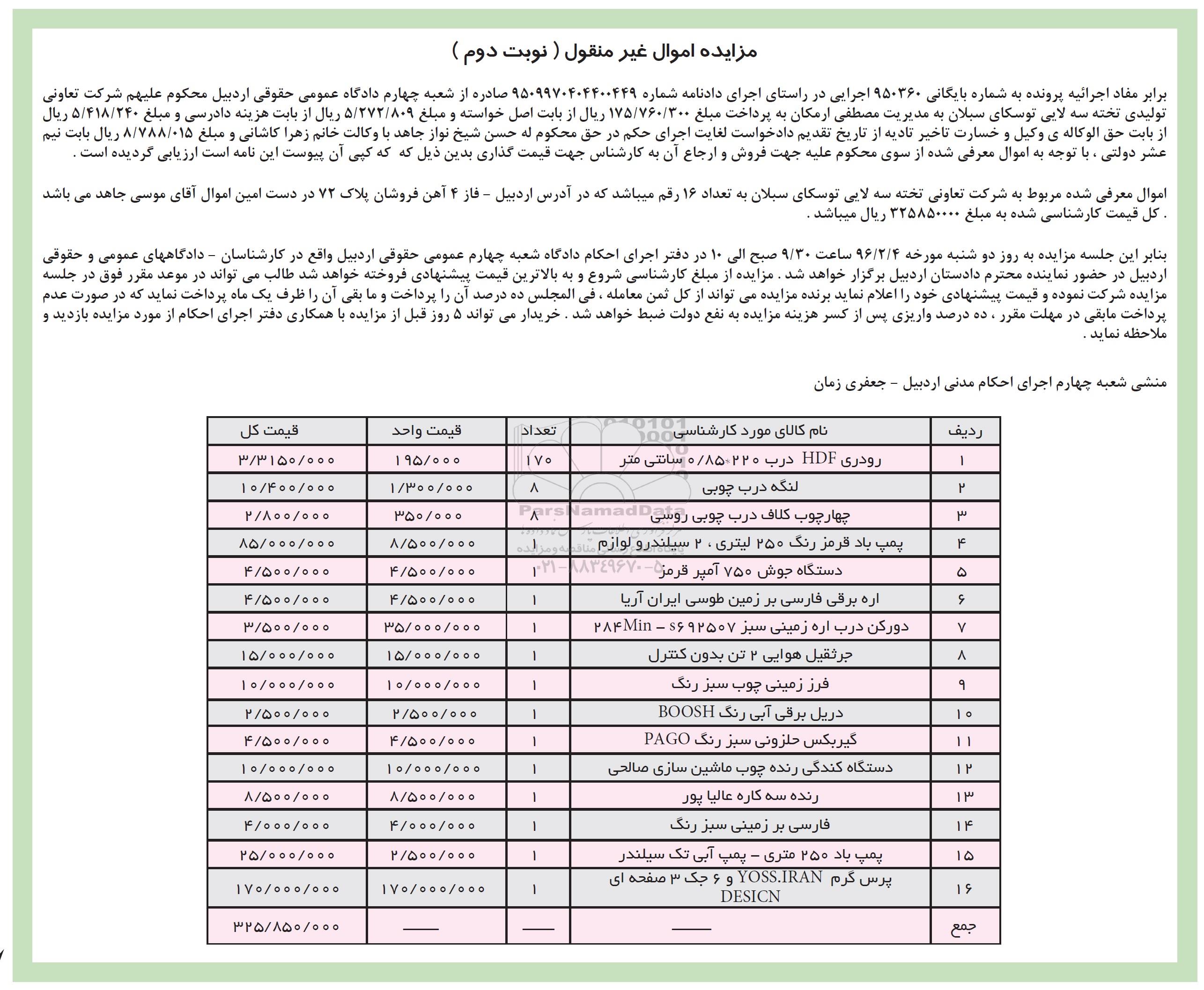 روز سه شنبه مورخه 95.12.17 ساعت 9:30 صبح الی 10 در دفتر اجرای احکام دادگاه شعبه چهارم عمومی حقوقی اردبیل واقع در کارشناسان ، دادگاه های عمومی و حقوقی اردبیل