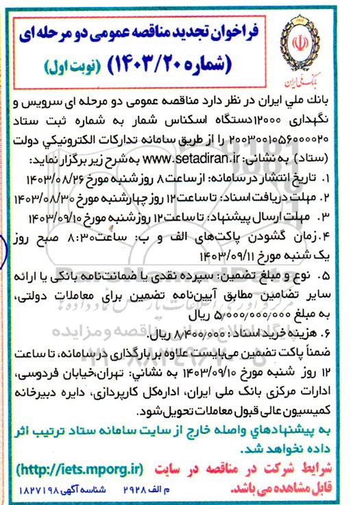 بانک ملی ایران در نظر دارد مناقصه عمومی دو مرحله ای سرویس و نگهداری 12000 دستگاه اسکناس شمار به شماره ثبت ستاد 2003001056000020 را از طریق سامانه تدارکات الکترونیکی دولت (ستاد) به شرح زیر برگزار نماید .