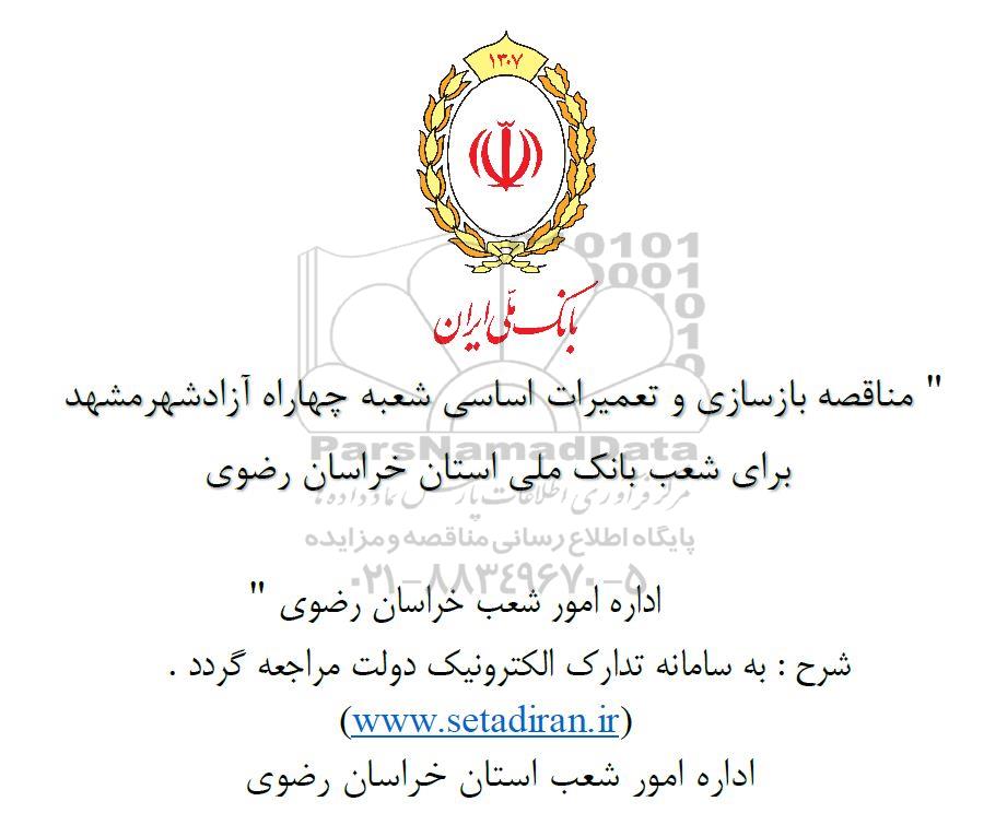 مناقصه بازسازی و تعمیرات اساسی شعبه چهاراه آزادشهر مشهد