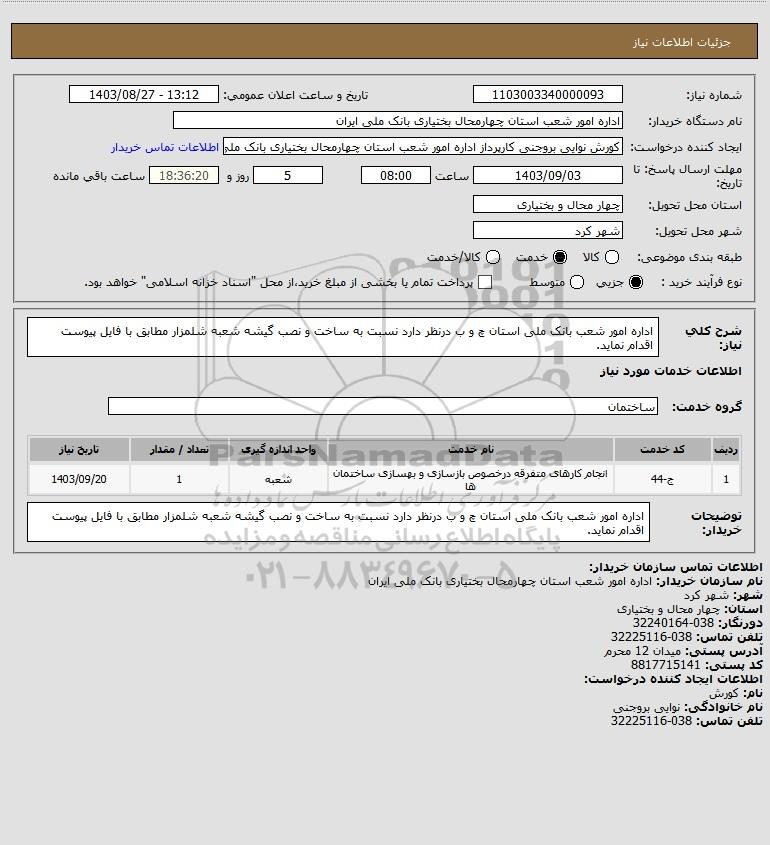 شرح کلی نیاز: اداره امور شعب بانک ملی استان چ و ب درنظر دارد نسبت به ساخت و نصب گیشه شعبه شلمزار مطابق با فایل پیوست اقدام نماید.