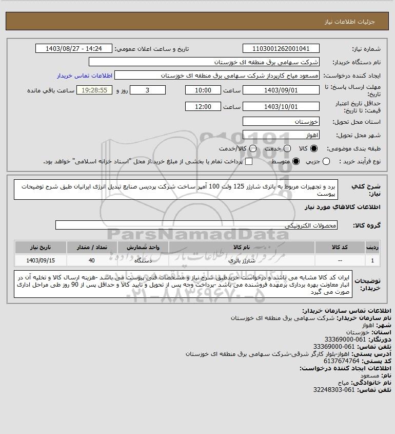 شرح کلی نیاز: برد و تجهیزات مربوط به باتری شارژر 125 ولت 100 آمپر ساخت شرکت پردیس صنایع تبدیل انرژی ایرانیان طبق شرح توضیحات پیوست