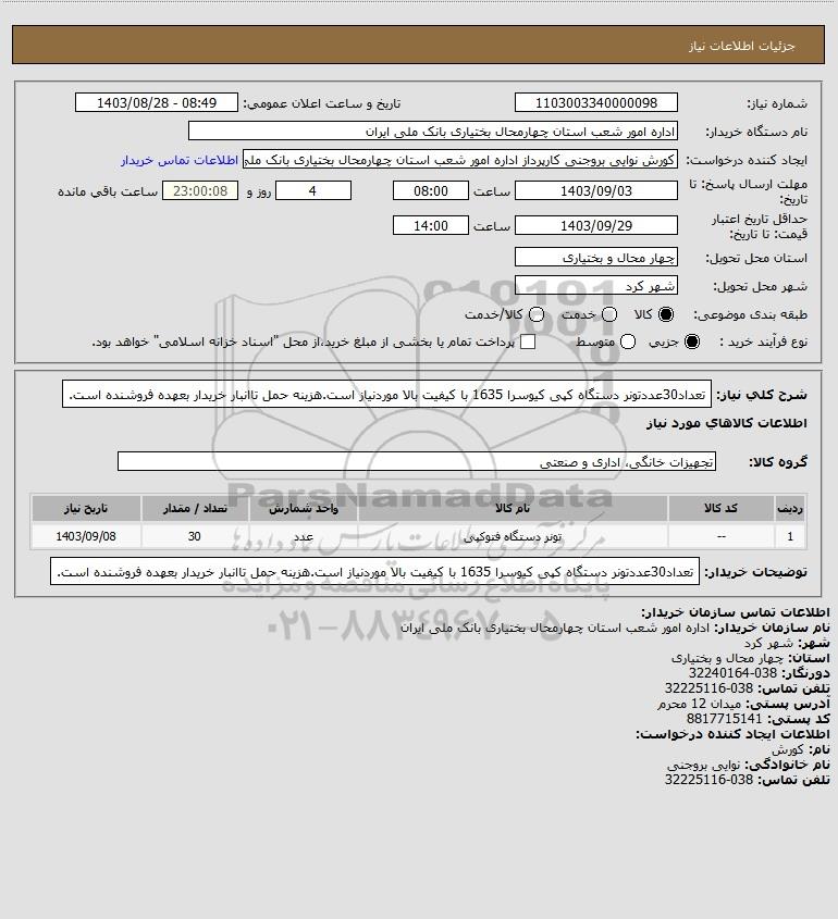 شرح کلی نیاز: تعداد30عددتونر دستگاه کپی کیوسرا 1635 با کیفیت بالا موردنیاز است.هزینه حمل تاانبار خریدار بعهده فروشنده است.