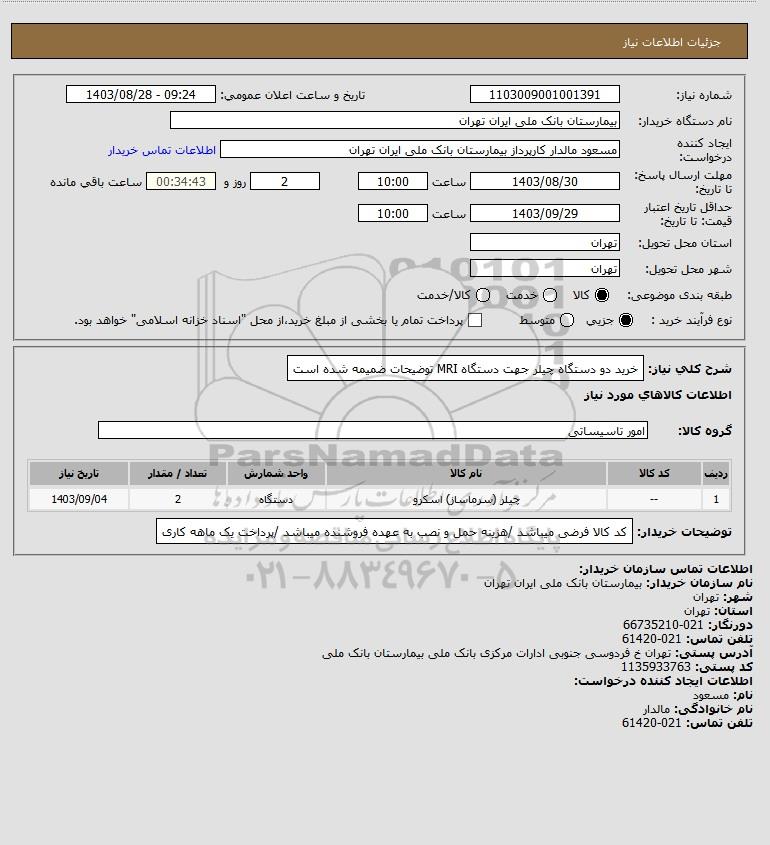 نام دستگاه خریدار:بیمارستان بانک ملی ایران تهران