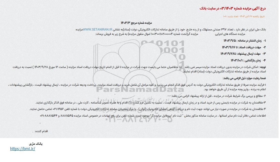 درج آگهی مزایده شماره 03/1403 در سایت بانک