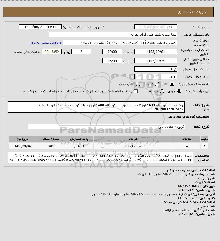نام سازمان خریدار: بیمارستان بانک ملی ایران تهران